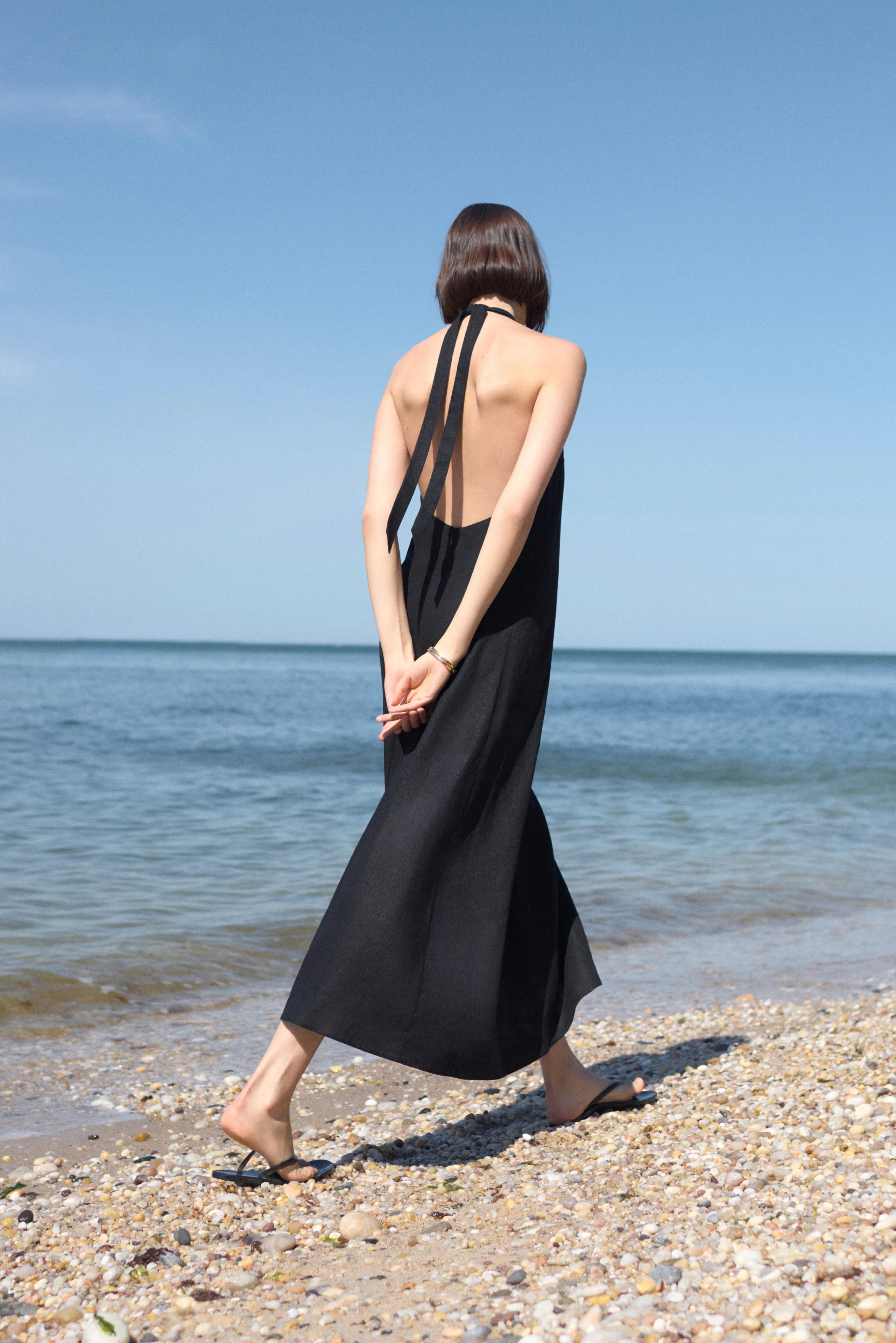 - Maxi-style halter-neck dress with adjustable neck tie. Lined bodice and open back. Center-back zip.